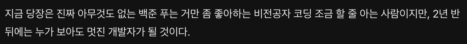 전공자에 비해서 3년 정도의 공부 기간이 부족한 것도 사실이다. 하지만 이를 변명의 소재로 사용하고 싶지는 않다. 나를 평가하는 사람은 나를 한 명의 개발자로 바라보지, 비전공자인데 이정도나 했네? 라고 생각하지 않기 때문이다.