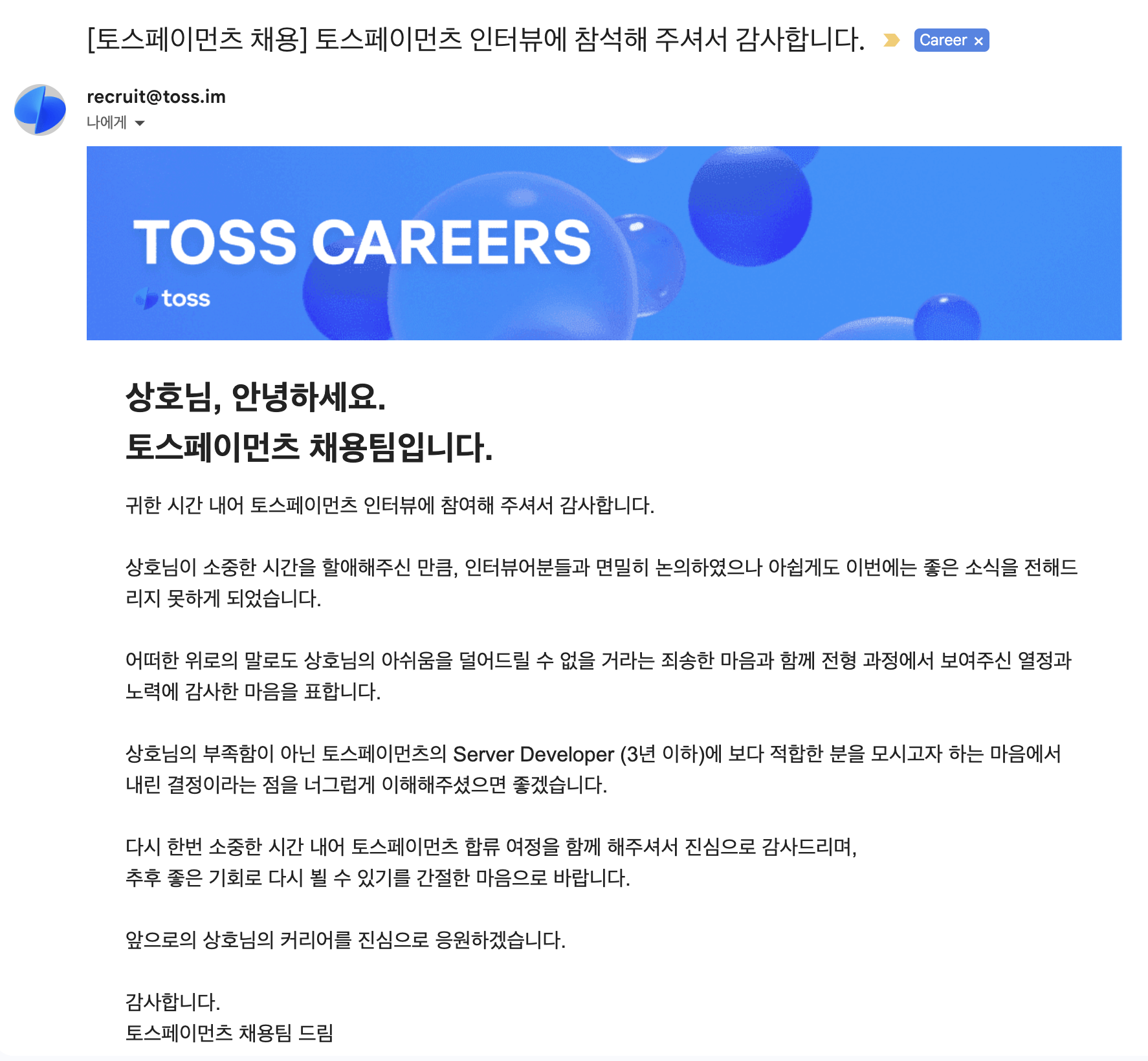 그렇게 이 글을 작성하기 약 6시간 전 쯤, 불합격 메일을 받게 되었다.