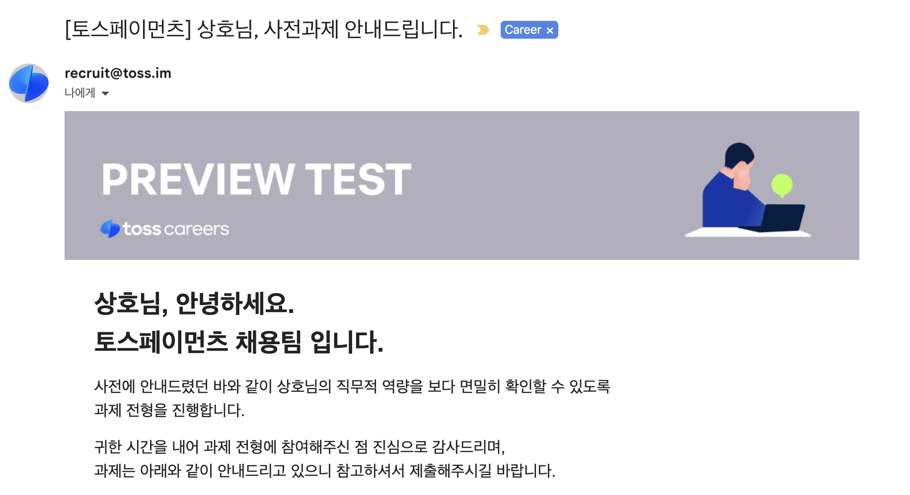 이 때 당시에는 그렙(프로그래머스)의 코딩테스트를 통과하여 과제 전형을 진행하던 중이었는데, 과감하게 포기하고 토스에 집중하기로 결정했다. 시간이 부족하기도 했고, 그렙의 기술 스택(루비)와 맞지 않아서 원하는 정도의 구현을 하기 어려울 것 같다고 판단했기 때문이다.