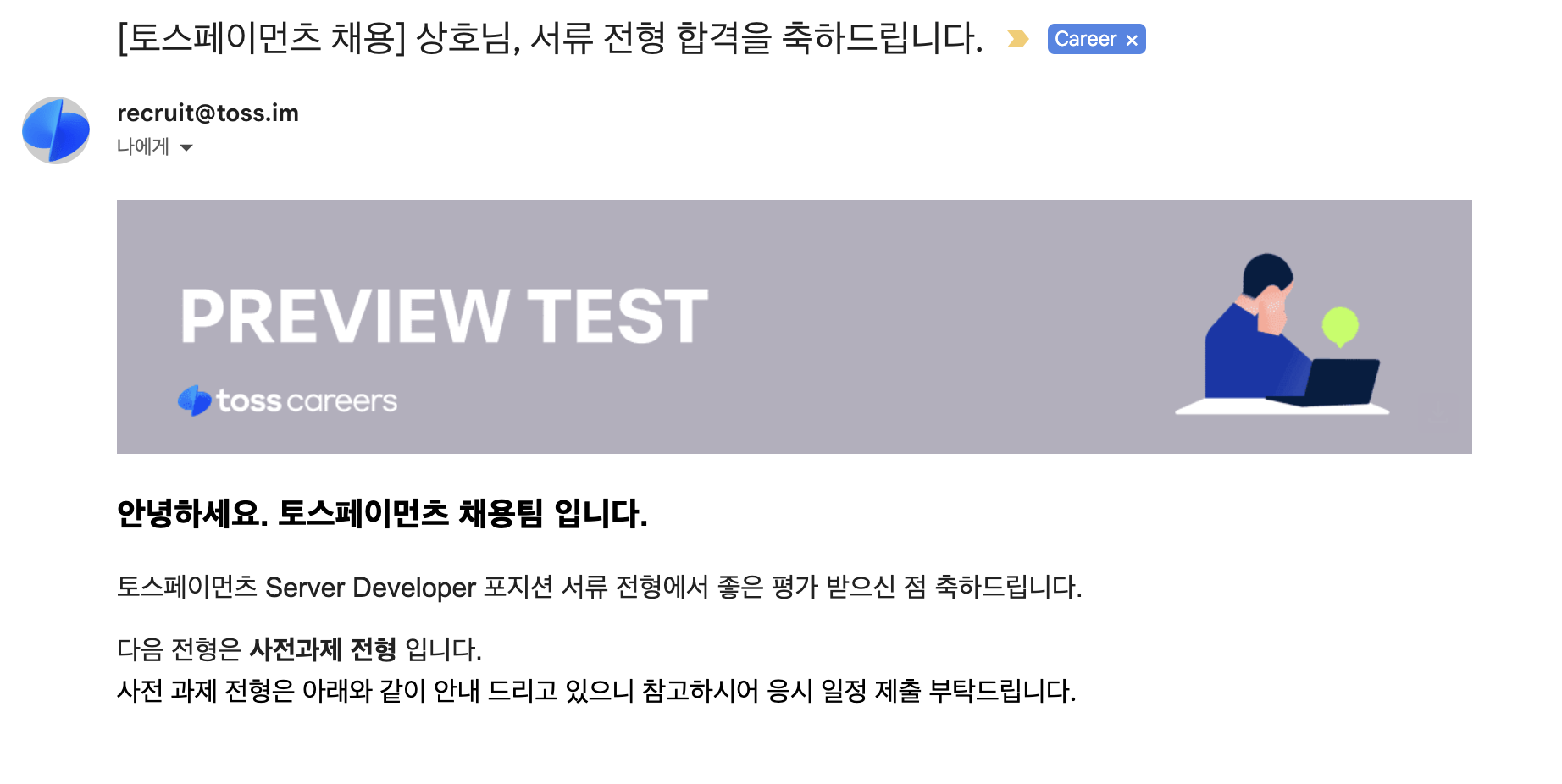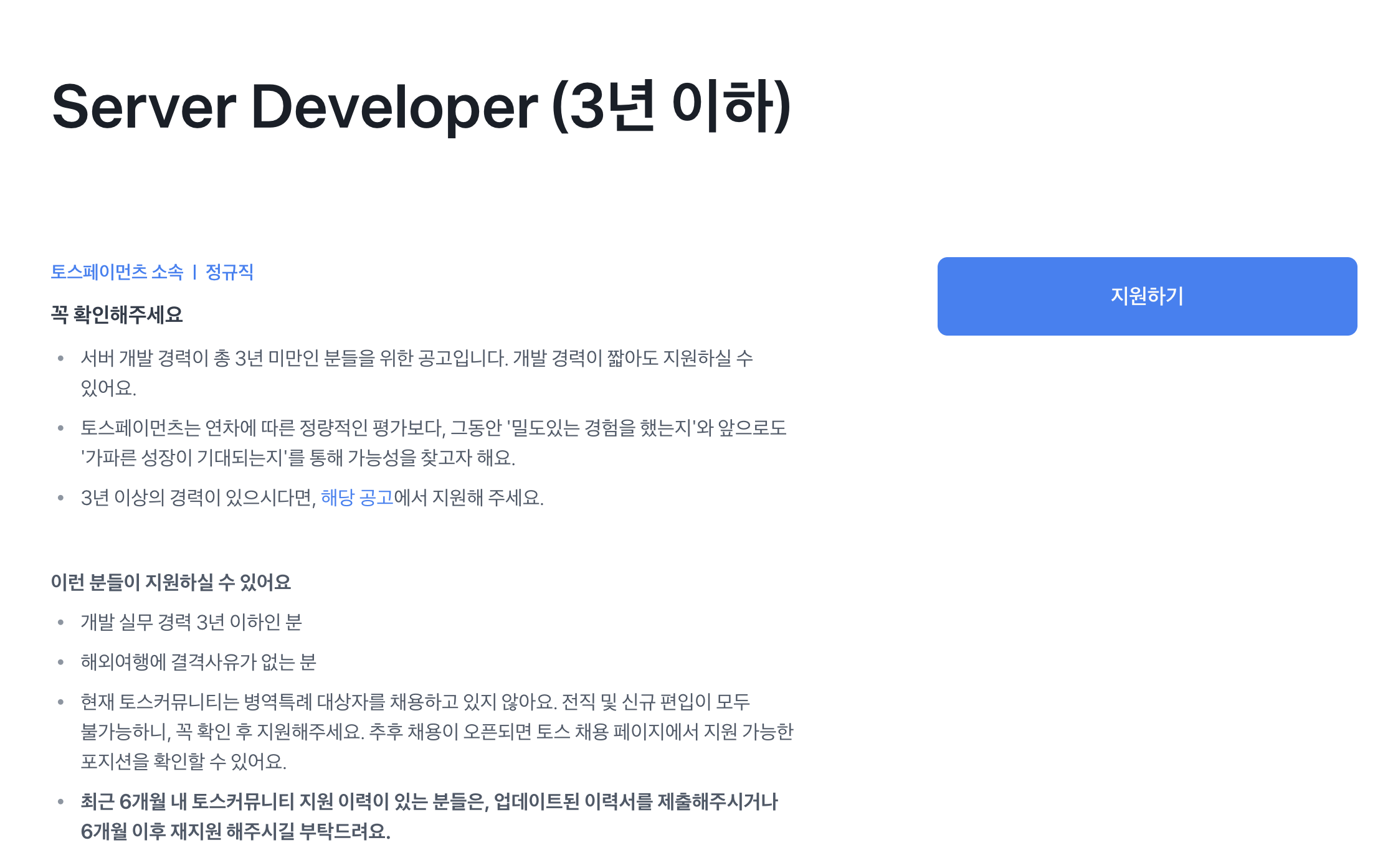 3월 12일, 큰 기대는 하지 않고 토스페이먼츠 3년 이하 서버 개발자에 지원을 했다. 그 때 당시에는 토스페이먼츠에 대해서도 잘 모르는 상태였다. 또한 포트폴리오와 이력서를 마무리하자마자 지원했던 것이라서 더욱 큰 생각이 없었다.