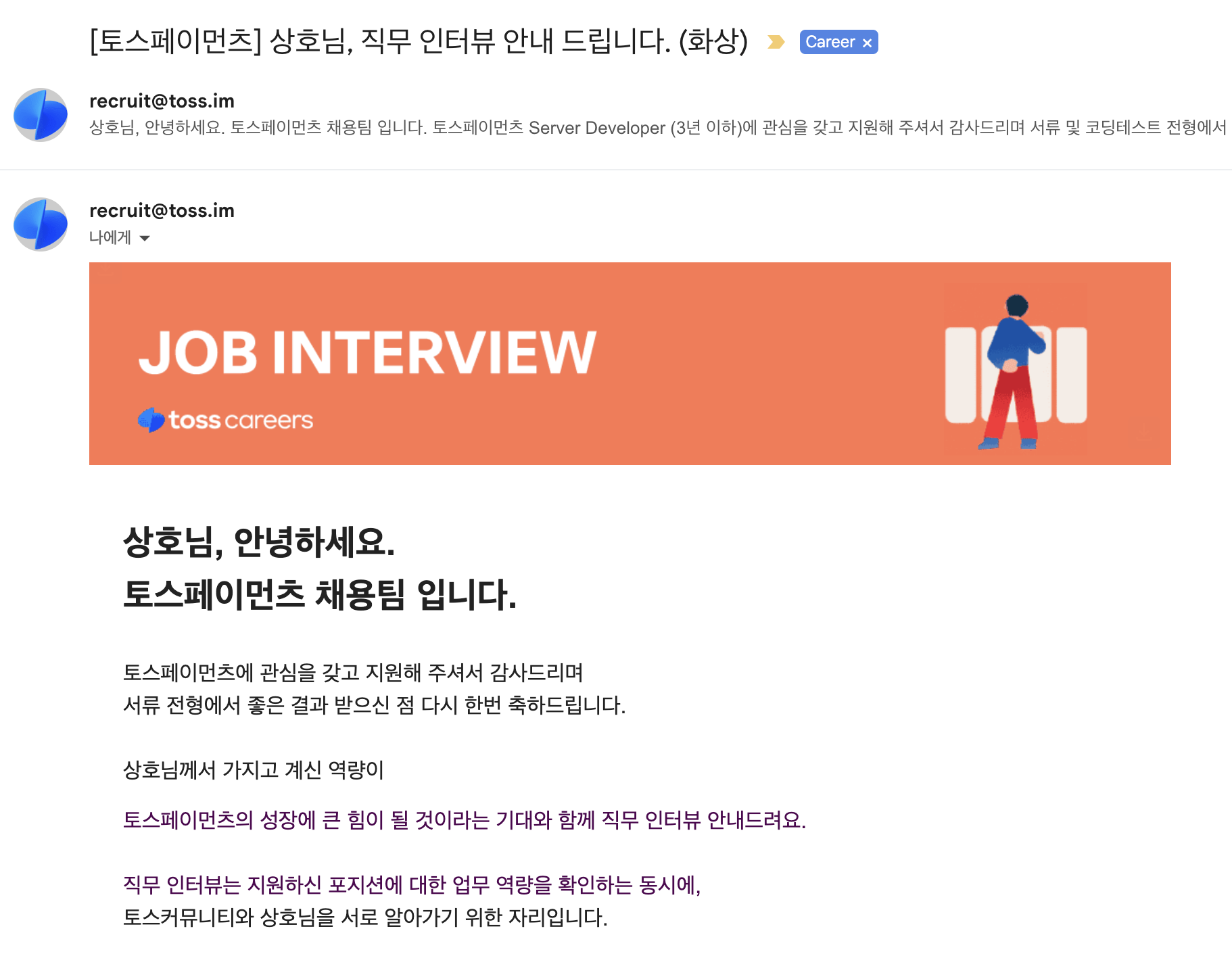처음에는 많이 얼떨떨했지만 곧 기쁜 마음이 올라왔다. 왜냐하면 약 한 달 넘게 열심히 갈아 끼운 포트폴리오가 좋은 평가를 받은 것이었기 때문이다. 더욱이 토스라니..내가 가기에는 한참 멀었다고 생각한 곳이었기에 더욱 기분이 좋았다.